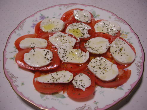 ワインを飲む時に主人がもっとも好きなおつまみは『トマトとモッツァレラチーズ』です。モッツァレラチーズは高タンパク低脂肪の健康的な食品ですo(^-^)oトマトとバジルと相性が良いのですが、今の季節はベランダにバジルがないため、バジルの粉末を振りかけています(画像で黒っぽく見えるのがそれです)。エクストラバージンオリーブオイルにレモンのしぼり汁を加え、天然塩を加えてよく混ぜたものをドレッシングとして回しかけます。この『トマトとモッツァレラチーズ』をフランスパンにのせて食べるとボリューム満点です♪残ったオリーブオイルもフランスパンで全てきれいにいただきます。ワイン好きな方は是非どうぞ♪