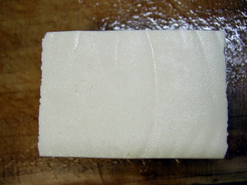 お豆腐を買いました。上から見たらごくフツーのお豆腐です。(少なくとも名古屋では・・・)ところが、こんなこと になっていました!!最初は、私がパックから出す時に失敗したのだと思いました。(時々やります~~;)でも、パックを見てもシンクを見ても、どこにもお豆腐の『かたわれ』はありませんでした(ーー;)お豆腐はしょっちゅう食べていますが、こんなことは初めてです。あまりにも見事な『えぐれ』っぷりに、主人を台所に呼び、デジカメで写真まで撮ってしまいました(~~;)お豆腐のパックは側面が透明ではないので、まさかこんな風になっているとは思いもしませんでした。購入する時点では分からないので、『運が悪かった』のでしょうね(涙)