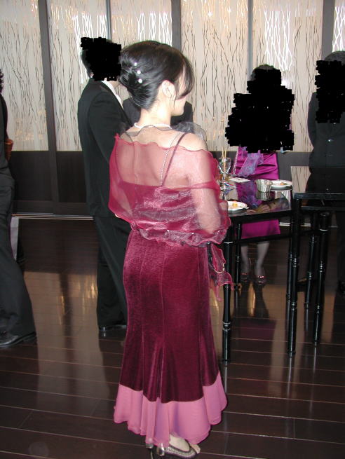 ちょうど一ヶ月前に友人の結婚式に参列しました。そう。例の 女性は黒衣装禁止 の結婚式です(汗)黒を着るつもりでいた私ですが、受付まで頼まれて「黒は禁止ね」 と念押しされていたので大枚はたいて(?)ドレスを新調したのでした。それがコレ↓頼もしい背中(汗)力強い二の腕(汗) バケツのようなオケツ(大汗)そう・・・。 チビ で おデブ です パペムのたっての希望()により写真をアップしましたが、誹謗中傷はご容赦くださいm(_ _)m後ろ姿の写真しかお見せできなくて残念ですが、前はめちゃセクシーダイナマイト なのよん♪ <うそつけ主人が写してくれたこの写真を見て、ダイエットが急務な課題であることを改めて自覚したのでした。。。※因みに今日は主人の誕生日です <日記とはまるで無関係(汗)