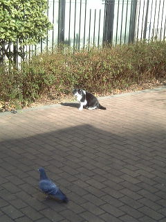お昼を食べて職場に戻ろうとしたところ、鳩をくわえた猫が、目の前の道路を横断して行きました私はかなり驚いてしまったのですが、早速主人に報告したところ、「前、猫が鳩を捕まえるとこ見たよ」と言われました猫ちゃんったら、かなり 野性的 なのね。。。狙ってる間違いなく狙ってる