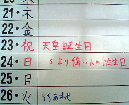 うちの職場には共用のホワイトボードがあります。出張や休暇の予定を書き込むためのものです。ふと見てみると、いつの間に・・・(ーー;)24日は 私の誕生日 ですからいつの間に天皇陛下より偉くなったんだ・・・Kくんへいたずら書きはやめましょう。。。