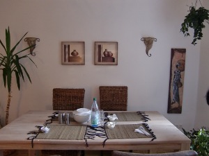 南国のリゾート地へ行ってきたわけではありませんダーがドイツで一緒に仕事をしている人(トルコ人男性)が昨夜、ご自宅でのディナーに招待してくれたんですアフリカ好きな奥様の趣味で飾られた室内。素敵なお部屋でしたぁ~私も彼と奥様とは二度ほどお目にかかったことがあったのですがゆっくり話をしたことはなかったので楽しみにしていました彼が作ってくれたというトルコ料理チキンは前日から下ごしらえしてくれていたらしくスパイスがたっぷりしみ込んでいて美味しかったです右奥のお米っぽいのは、名前を聞いても分からず「クスクスみたいなもの」と説明されて納得したのですがあとで調べてみたら「ブルグル・ピラウ」というトルコ料理で挽き割り小麦のピラウなのだそうですピラウ・・・ そうですこの「ピラウ」が「ピラフ」の語源なのだとか左奥のはラタトゥイユみたいな野菜の煮込み料理でした。ブルグル・ピラウは、野菜の煮込みや肉料理の付け合せにされるそうなのですが「付け合せ」というよりは「主食」感覚でいただきましたパラパラっとしていてかなり好みでした食後は場所を移してソファーでティータイムトルコのブラックティーをいただきながら話が弾みました(会話は英語なので私はいつもより無口でした/笑)別の部屋にペットのモルモット(エディくん)がいたのですが・・・エディくん一人(一匹)にこの部屋は広すぎませんかやんちゃで飛び跳ねたりして、とても可愛かったです楽しくてあっという間に時間が過ぎ車で送ってもらってホテルに着いたのは午前0時ドイツでの楽しい思い出がまた一つ増えました