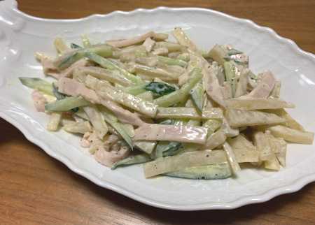 今日は雨のち晴れの予報でスマホのお天気アプリでも午後はだったのでプールへ出かける前にバスタオルを外干ししたのですが帰宅したら濡れたまま冷たくなっていました乾かすためではなく冷やすために外へ出したような…完全に失敗でした~・~・~・~・~・~先日いただいたヤーコンのレシピを調べてみたら生で食べてもシャリシャリして美味しいようなのできゅうりとハムと一緒にサラダにしてみました。大根の代わりに…くらいのつもりだったのですがヤーコン自体のほんのりとした甘さも手伝って大根で作るサラダよりだいぶ美味しかったです【畑の梨】と呼ばれているのも頷けます。健康野菜として注目されているヤーコンについて少しだけネットの抜粋文を掲載させてください。特に注目されている栄養素は「フラクトオリゴ糖」と「食物繊維」の2つ。フラクトオリゴ糖は、人の胃や小腸で分解・吸収されにくい性質があり、口にするとほとんどがそのまま大腸へと運ばれます。そして、大腸内でビフィズス菌をはじめとする乳酸菌のエサとなり、善玉菌を増やして腸内環境を整え、便秘の改善や、コレステロール、中性脂肪、血糖値、血圧などの数値を下げる働きをします。また、ヤーコンには食物繊維も多く含まれていますが、その大半が、余分な脂質や糖を排出する働きをする水溶性の食物繊維です。フラクトオリゴ糖と食物繊維の組み合わせによって、便秘改善や生活習慣病予防などの効果がいっそう高まります。有難いことがいっぱいで、すごく貴重に思えてきましたヤーコンのきんぴらも作りましたが食感をしっかり残したくてかなり太めに切ったので見た感じはきんぴらっぽくありません(笑)牛肉と一緒に中華風に炒めても美味しそうですが私は生でサラダにするのが一番かな…と。なかなか手に入らないヤーコンですが手に入ったらまたサラダにしたいです