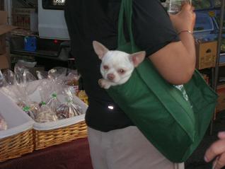 「ビバリーヒルズチワワ」とか映画が出来ちゃうくらい人気のChihuahua小さいのがかわいい?のかかなりの人気で、大きいおじさんが小さいチワワを散歩させているのを良く見かけます。KCCのファーマーズマーケットも入り口にペットは会場に入れないようにと注意書きがあっても、こんな風に連れてきちゃう人も・・・ちょっとご機嫌斜め?な感じ・・・眠いのか?窮屈なのか?でも車に置き去りもかわいそうだけど、公共の場ではルールを飼い主さんが守らないといけませんね。チワワは超小型犬ゆえに、長生きはするが病気を伴うこともある。体は小さくても、大胆で勇敢な面があり、自分より大きい犬にも臆することなくむかっていく。小さいから扱いやすい?という偏見を持たず、幼少時にきちんとした教育をすれば良きペットとなり、甘やかすと小さい暴君となりかねないので注意が必要なのだそうです。1人の人に愛情を集中させる為、焼きもちを焼くことも多い。(ちょっと気難しい?正確なのかもしれませんね)寒さにも弱いため、寒い時には洋服を着せるというのもお勧めらしい。洋服って飼い主の自己満足?かと思ったけど、犬種によっては必要な時もあるのだなあと納得。冬の寒い時期は、我が家のヨーキーも必要としてたしね。犬の洋服、これ以外と高い!って知ってました?ヨーキーのトレーナー、ちょっとしか生地使ってないのに6千円だったもんね、人間のは3千円に対して。