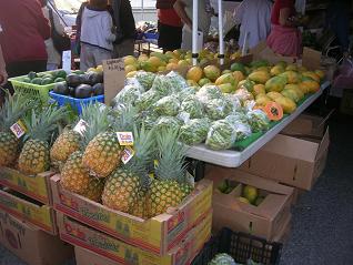 1週間に1回、KCCの朝市(土曜日)で1週間分の野菜を調達しています。なので金曜日になると冷蔵庫の中は、がら~んとしてきて寂しい・・・野菜だけでも数件の農家?が出展してますが、毎回買うのは決まったお店になってきちゃいました。安さと、新鮮さ?と品揃えとかでしょうかね。それぞれのお店は少しづつ品揃えが違います。ここではパイナップル(3ドル50セント)とブロッコリー(2房2ドル)、いんげん(1袋2ドル)、菜の花(1束1ドル50セント)などなど。お花はここで。サービスでティーリーフもくれます。なぜかここのお花は持ちがいいんです、元気で1ヶ月近くもつことも・・・(他のお店のは4~5日で枯れちゃうものもあって・・・まあ普通かもしれないけど)でも、みんな販売開始時間前に好きなお花はお取り置きしちゃうので早く行かないと残り少なくなってます。少しづつ新しいお店も出ているので、用はないけどぐるっと一回りしています。ローカルで育ったもので生活できるって幸せですね。もちろんこれだけでは足りないので、後はスーパーで買い足してますが・・・