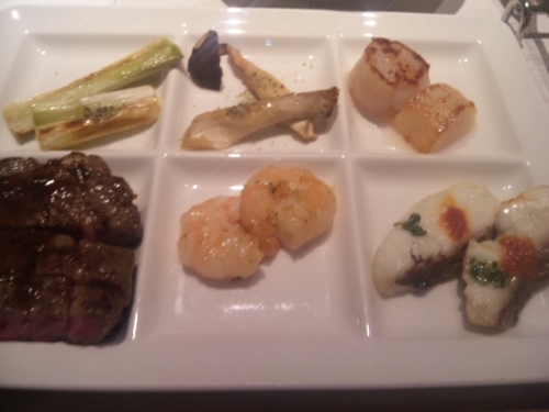 いもうとと茄子好きと浅草ビューホテルへ行ってきました。26階にあるスカイグリルブッフェ&バー「武蔵」へ。ディナーは3990円+サービス料。和洋中150種類以上の料理が自慢らしいです(ドリンクバー付)。どんな料理があるかは食べログ見て頂くとして・・・ これから120分の戦争が始まります。自分はもっぱらグリルを。牛ロース・海老・帆立・なんか白身魚・ネギ・エリンギ・帆立。ああ、結構美味しいじゃないですか。ドラフト2巡目。白身魚out、牛ハラミin。3巡目。同じ面子wでっかいチーズの上で絡ませたパスタもウリなはずですが、すでに絡ませ済みの物が置いてありました。ガトーショコラっぽいの、ブラックコーヒーに合います。メスたちの欲望夜も更けていきます。