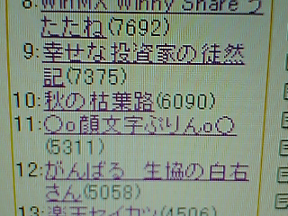 とりあえず、1週間1万HIT記念もあるし1日2千越えしている画像貼り付け。1/6:10641/7:28421/8:3931/9:96激しくバラつきのあるHIT数^^;9日はサーバーダウンか、ページ表示が中々出来なかったので少ない様子。で、1週間1万HITの件。31日に6万HITなので、1月1日~7日のHIT数で計算。1/1:1309 1/2:1065 1/3:555 1/4:2782 1/5:354 1/6:1064 1/7:2842合計数は9971(!?・・・29足りない(ぉぃまあほぼ1万ですよ、アハハー^^;内心かなり落ち込んでいる秋空でした(ぁ