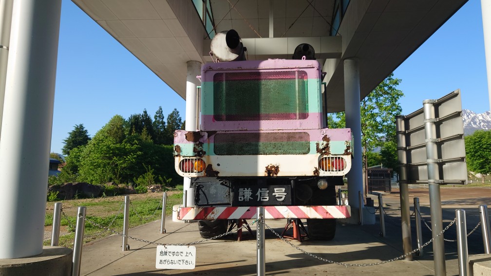 除雪車の外装は、50年代初旬までうす緑色で、その後、黄色に塗り替え、除雪作業 に使用していました。現在の外装ペインティングは、1991年に上越市で開催された除雪機械展示会に モニュメントとして出展にあたり、上越教育大学の洞谷亜里佐先生のデザインにより 作成されました。