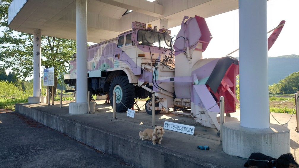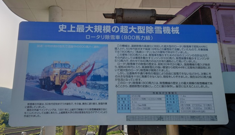 このロータリ除雪車(800馬力)は、除雪機械の歴史上の最大規模の除雪機械であ ることから、道路除雪の史跡とし、ここに展示保存し、後世に伝えることとしました