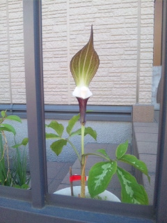 ザゼンソウかと思いきやユキモチソウと書いてありました。パラボラアンテナのような苞?の小さな花。