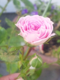 朝日が当たる場所に移動したミニバラ、ハナグルマ。