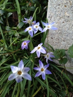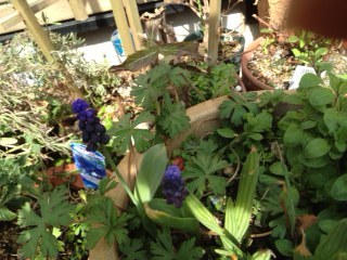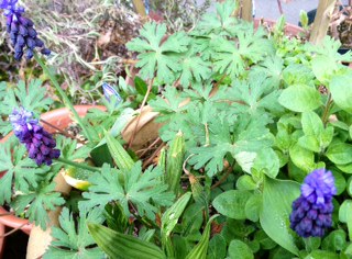ふうろ草(ゲラニウム)・ビルウォーリス。ようやく咲きました!白い鳥籠に入れてるムスカリ。伸びたら飛び出してしまうかな・・・花にら。まさか地下をくぐって塀を越えたのかしら?プルモナリア・ブルーエンサイン。青いアンティーク風水瓶に植えてます。青好きの私は車も水色です・・・すみれ。イエイオン・セロウィアナム。もうすぐ咲きそうです。黄色い花にらという感じの花。