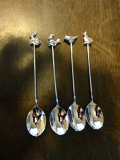 フランス旅行の申し込みに行った帰り、アフタヌーンティーという雑貨屋で、 動物の柄のティースプーンを買いました。 ピックもあったけど、 スプーンの方がよく使うから実用的ですよね。左から、うさぎ、リス、鳥、犬です。 使うのがもったいないほど可愛いです。