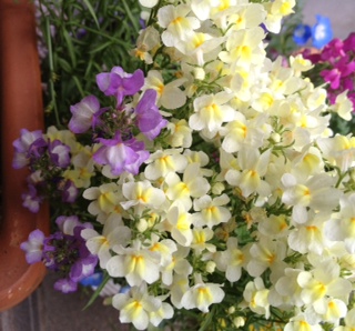 花にら。クレマチス・ビチセラ系ベティコーニング。ますます伸びてきてます。クレマチス・ビチセラ系ベティコーニングを絡ませてる槍のトレリス。塀の上のテラコッタなどの鉢には、左から早咲久留米つつじ・レジナ、苧環(おだまき)・乙女風鈴、なでしこ、宿根プリムラ2種を植えてます。アンティーク風のウェルカムボード。白い鳥かごにはムスカリ。アイアンの鳥かごには、カンパニュラ・ブルーワンダー。ベロニカ・オックスフォードブルー。ビオラ。紫はパンジー。ピンクはストック。ストック。