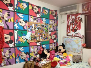 長女マッキーの個室。ディズニー好きなので、壁に布を張ったり、 ぬいぐるみを置いたりしていたのですが、 流石に今春、大学を卒業し社会人になったからか、心機一転、部屋の模様替えをしたようです。 青の花柄のファブリックを張り、 コルクボードに和紙や絵はがきなど貼ってます。 少し大人っぽくなりましたよね。 私の好きな青が基調でいいなあ。 個室があって羨ましい。 私と主人の寝室は、リビングの隣の和室でプライベートも インテリアの自由も無いからね。 二階は、子ども達三人の個室なのです。羨ましい。 私の個室は庭かと思って、模様替えしています。 それと台所? 、、、