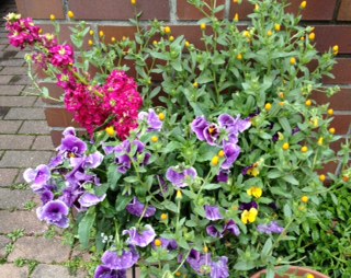 ヒマラヤ雪の下。ビオラ。パンジー。ピンクはストック。黄色はパンジー。白はビオラ。パンジー。白い鳥かごにムスカリの鉢を入れてます。ピンクはストック。黄色は冬知らず。紫はパンジー。黄色と紫はビオラ。ヒヤシンス。つる日日草。