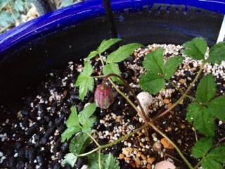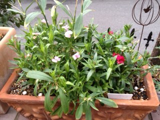都忘れ(ピンク)を以前から地植えしてますが、ようやく芽が出てきました。鯛釣り草。葉は出てくるけど、花は咲くかな・・・下の斑入り葉は、稚児百合。クレマチス・パテンス系ビオレットの蕾。ピンクの一重です。アイビー柄のトレリスに絡ませてます。オベリスクにも絡ませ、木のラティスにも・・・つる日日草。瞳草・サファイアの芽。ペチュニア・ピカソ。ノースポール。ムスカリ。