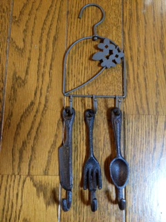 100円ショップSeriaで買ったカラトリーフックをキャンドゥで買った花のフックに掛けます。でも、真ん中のフォークの穴が小さくて入らない・・・代わりに真ん中に鳥かごを下げてみたけど、違和感・・・タイルに青い花のシールを貼ってます。ドアフックを付けてみました。絵の額が掛かってるので端に付けました。裏側にはもう一つのドアフックも。フォークを上のフックに引っかけてみました。鳥籠はドアフックに掛けました。キッチンの入り口に、熊のガーランドの代わりにキッチンアイテムガーランドを掛けようとしたら、紐の長さが足りなかったのです・・・なので、換気扇にマグネットフックを付けて、そこにキッチンアイテムガーランドを掛けました。フライパンやカラトリー、ワインにフランスパンなど。フックの穴に入らなかったフォークも 包装に付いていた黒い針金を使って、フックの穴とフォークの穴を結び付け、やっと三個並べて掛けられました。やはりこの方がいいですよね。