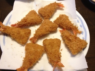 今夜の夕食は、エビフライ。肉団子と玉ねぎとサツマイモの煮物。ヨシケイの食材の人参とカボチャを長女マッキーの野菜ケーキに使われてしまったので、代わりに玉ねぎとサツマイモを使いました。胡瓜の梅和え。スパゲティサラダ。キャベツの千切り。水にさらしてからザルにあげるとパリっとします。白菜の味噌汁。緑の部分を使いました。