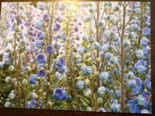 以前買った絵葉書です。なんという花か書いてないけど素敵な青!ピンクのハートのケーキみたい。青の花の絵葉書を両面タイプの木製写真立てに入れて、木製イーゼルの上にのせました。額縁風プランターに手直ししたくて買ったのだけど、このままでもいいかも・・・両面なので、裏にはピンクの花の絵はがきも。青と白のトイレセットも買いました。涼しそうだから夏向きかな?ミルク瓶にはドライフラワーになったスターチスを生けました。隣のプレートのあるブリキ鉢には多肉植物を植えてます。