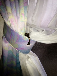 レースのカーテンを100円ショップのフックで留めました。金のなる木や子持ち草の鉢、青い瓶にドライフラワーの薔薇、アンティークの小物入れなど置いてます。両側にフックで留めました。3つ入りのフックだったので、青い花柄の鉢に緑のコサージュをフックで付けました。トイレのプレート。ドアノブに掛けたけど不安定・・・木のプレートを貼っていたのですが、その上に、バラの押しピンを挿して掛けました。浮いてるけど、大丈夫かな・・・
