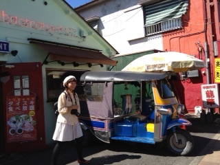 福生のベイサイドストリートのタイ料理・カオマンガイで、長女とランチしました。店の前にはタイの自動三輪のタクシーのトゥクトゥクが置いてあります。マッキーが乗ってみました。タピオカ入りのミルクティーとマンゴージュース。日替わりランチ。キノコとパクチーとひき肉の炒め物とフライドエッグとタイ米。スープも付いてます。青パパイヤと人参・インゲン・ミニトマトのサラダ・ソムタムとタイ米。マッキーが一眼レフで撮ってました。トイレも素敵。マッキーがタイのゲストハウスを思い出すと言っていた。米軍人相手だからか、量が多くて食べきれず、テイクアウトさせてもらいました。美味しかったから、残すのもったいなかったのですよね。
