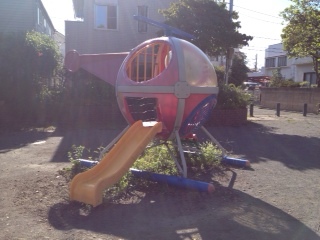 福生ベイサイドストリートの続きです。子どもの笑い声が聞こえたと思ったら、フレンドシップパークでサッカーをしてました。子ども達は写しませんが・・・ヘリコプターの形をした滑り台。ジャングルジム?アメ車っぽい遊具。先だけ枯れてない木。煉瓦作りの花壇。藤棚も。紫式部。ゼフィランサス。UFOみたいな遊具と、東屋。マリーゴールドとブルーサルビア。