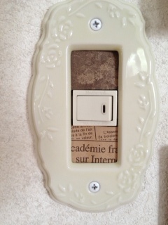 先日、福生の雑貨店TABASAで買った陶器のスイッチカバーを主人に取り付けてもらいました。長女マッキーが気に入ったバラ柄の白いカバー。隙間が空くので、包装紙を切って貼りました。白い壁に白カバーだから、アクセントになるかな? 周りには子ども達の写真など飾ってあります。私が気に入って買ったカバー。二つのスイッチがあまりないので、 最初、台所とダイニングのスイッチに付けてもらったら、 横の板にぶつかって斜めになってしまう。 かわりにトイレのスイッチに付けてもらいました。いろんなイラストが描いてあって可愛い。トイレのドアには造花とドアプレートも。ダイニングと台所のスイッチには、以前買った木のスイッチカバーが付けてあります。 隣の木にぶつかって斜めになってるけど。 キッチンのプレートは女の子です。 これも以前買って付けてある陶器のドアプレート。 間の隙間には、スイッチカバーが入っていた箱を切って貼りました。 隣の 飾り棚には、もらった人形などが飾ってあります。 下には、入間おやこ劇場の例会前のフリマで買った雑貨も。 おやこ劇場の会員さんの手作りです。
