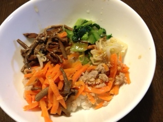 夕食は、ビビンバ丼。海老の包み揚げ。ニラ玉。玉ねぎとわかめとレタスのスープ。トムヤンクン。ランチした福生のタイ料理店からの持ち帰りも食べたので、一緒にタイのスープも飲んだのです。