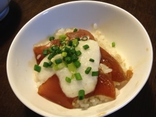 夕食は、マグロの漬け丼。とろろのやまかけ。鶏肉と野菜の炒め煮。冷奴。ワカメの味噌汁。