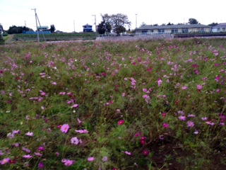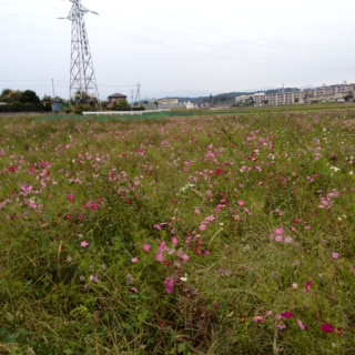 Kさんがうちに花を取りにきたついでに?飯能ゴルフ場の裏のコスモス畑でコスモスをもらってくるというので、一緒に行きました。明日の入間おやこ劇場の総会で使うのです。うちの庭から、野紺菊と秋明菊の花を全部切って持っていったので、ちょっと寂しいですが、まあもうすぐ枯れてしまうから役だったほうがいいかな。コスモス畑でコスマス祭りがあったそうです。その後は切って持っていってもいいそう。私もコスモスをもらいました。写真も撮らないとね。ピンク。白。濃いピンクも。白にピンクの縁取り。内側が濃いピンク。赤に近いピンク。ピンクと白が筋になってる。セイタカアワダチソウも近くに咲いてました。これは根から毒?を出すそうだから、コスモス畑に生えないといいけど・・・セイタカアワダチソウを調べたら、アレロパシーを有すると書いてありました。下記に引用します。 アレロパシー(英語: Allelopathy)とは、ある植物が他の植物の生長を抑える物質(アレロケミカル)を放出したり、あるいは動物や微生物を防いだり、あるいは引き寄せたりする効果の総称。邦訳では「他感作用」という。ギリシア語の αλληλων (allēlōn 互いに) + παθος (pathos 感受) からなる合成語である。1937年にドイツの植物学者であるハンス・モーリッシュにより提唱された。セイタカアワダチソウ:根からシスデヒドロマトリカリアエステルを出す。アレロパシーは、連作障害の原因の1つと考えられている。セイタカアワダチソウなどの帰化植物が勢力を拡大する要因の1つでもある。また、特定の植物により雑草や害虫を防除する生物農薬としての利用が注目されている。