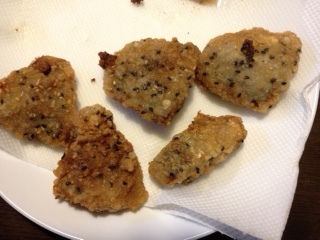 夕食は、アジの胡麻竜田揚げ。葱塩豆腐。湯豆腐にして、味付けを塩だれと葱で。水菜。ベーコン・キャベツ・人参・もやしのコンソメスープ。柿。