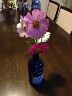 先日コスモス畑から摘んできたコスモスを青い高原ビールの瓶に生けてみました。もっと花はあるのだけどね。今日は何も用事が無いからヒマだなあと思って、テレビの録画を観たり、洗濯物を畳んだりしていたのだけど、主人が帰ってきて、皮膚科は次いつ受診するの?と訊かれ、ふと予約票を見たら、なんと今日でした・・・リハビリも今日予約だった・・・カレンダーに書き写すのを忘れて、気が付かなかったのです・・・あまりの物忘れにショック!明日、病院に予約の電話を入れて、謝ろう・・・無断キャンセルしてしまったんだし。