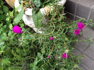 うちの花です。ポーチュラカ。桔梗。ポーチュラカ。ピンクは小輪ダリア。紫はトレニア。ポーチュラカ。小輪から超巨大輪まであります。