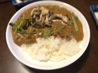 今夜の夕食は、昨日長女マッキーが買ってきたもの。勤務先のカフェスローがイベントに出店したけど、雨で売れ残り、売ったものや食材を原価でスタッフが買い取ってきたらしい。作らずに済んで助かりました。美味しかったですよ。インドの小豆入りカレー。蒸した高原ヒラタケとほうれん草をのせて。蒸し茄子。焼き油揚げ。フランクフルト。胡麻入りバンケット。柿。これはうちのですが。
