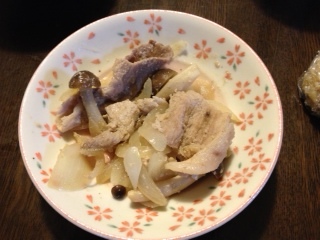 夕食は、豚肉とシメジと玉ねぎの生姜炒め。蒸し八つ頭。剥いて柚子味噌につけます。味噌と柚子ポンを合わせました。トマトとカッテージチーズ。モッツェレラチーズよりずっと低脂肪です。ヒジキと人参とがんもどきの煮物。千切りキャベツ。付け合せだけど、水にさらしてシャキッとさせたから別添え、薩摩芋と葱の味噌汁。柿。