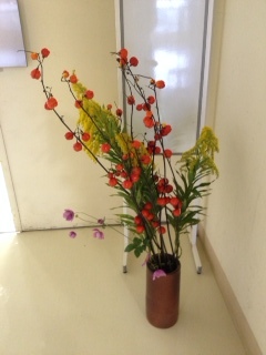 今日は、入間おやこ劇場の総会でしたが、午後の例会(鑑賞会)決めだけ参加しました。昨日Kさんがうちやコスモス畑から花を持っていき、ご自宅のも一緒にして花を生けてくれました。入口には、うちのピンクの秋明菊や、黄色いセイタカアワダチソウ、オレンジのほおずき?が生けてありました。素敵ですよね。受付の花。コスモスをガラスの器に入れて。剣山ではなく、格子状の網目に生けてる。コスモス畑で風で倒れ、茎が曲がってたけどそれも味がありますね。ススキも風流ですね。花瓶の縁近くのピンクの小花は、うちの野紺菊。白いかごにいっぱい。次の小学生以上例会のだるま劇場の「暮らしのト長調」の紹介。例会当番が、だるま食堂の3人に扮して大奮闘。Uさんの演技力、Sさんの淡々とした語りにビックリ!幼児例会の「音とリズムのピクニック」は例会当番の子ども達が大活躍。可愛い声で歌ってくれました。ケーキとコーヒーでまったり。紙コップのイラストはEさんの消しゴムはんこで。左のピノキオのかかしは、奥富のかかし祭りに出展予定。「今、人間になって幸せですか?」「大丈夫だよ。入間おやこ劇場がある限り!」とのこと。本当に不安な世の中だけど、大丈夫と思えるのは幸せかも。例会の看板です。Nさんが持ってきてくれたトレニア。下のレースペーパーも合ってますね。左の青や緑の色がついた紙は、議決権を示すものです。うちのサークルは中学生以上しか居ないので、幼児や小学生の例会を選ぶ権利はないのですよね。先日の西グループ合同例会決めで取り損ねたドラマリーデングの劇「空の村号」を今度こそ取りたかったのですが、また惜しくも次点で敗れてしまいました。まあ主張するだけしたから仕方ないか。キャストは先日観た劇とは違うと聞いたので、ちょっとテンションが落ちてしまった。Aさんも昨日見て良かったと言ってたから心強かったのですが。総会でEさん達が売ってた雑貨の中から一つ買ってきました。ガラスの小瓶の首にレースを付けて、ラベンダーのドライフラワーを飾ったもの。クラフト工房を立ち上げると言うので、私も参加させてもらおうかな。100円ショップなどで買った材料をそのまま放置してしまってるので、材料持ち込みで教えてもらったりしたいですね。
