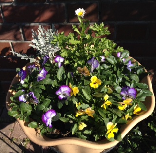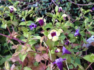 うちの花です。ハーブゼラニウム・ナツメグゴールデン。アイビーゼラニウム・シュガーベビーの蕾。ビオラ。ノースポール。白妙菊。ガーデンシクラメン。菊。
