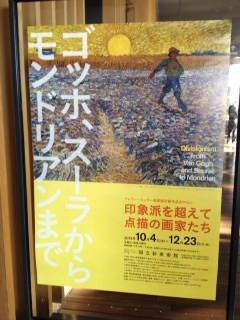 大学時代の友達Yさんと、国立新美術館に行ってきました。「印象派を越えて点描の画家たち~ゴッホ、スーラからモンドリアンまで」(クレラー=ミュラー美術館所蔵作品を中心に)リアリズムが点描を経て抽象画に移る過程のようです。私はやはりゴッホが好きなので、本も買いました。Yさん推薦のもっと知りたいシリーズのゴッホです。絵のことだけでなく、時代背景やゴッホ自身のことが詳しく書かれてるので、帰りの電車で読みふけってしまいました。好きな絵の絵葉書を購入。「レストランの内部」(ゴッホ)。印象派の点描を真似して描いてるけど、色が濁っていたりと印象派にはなりきってない。ゴッホの画風を確立するための過程だったらしい。麦束のある月の出の風景(ゴッホ)。「種まく人」(ゴッホ)。先日フランスに行ったときミレーの家も寄ったが、ゴッホがミレーの絵を模写したものも置いてあった。構図は同じでも、タッチが違うので、別物でしたね。「もっと知りたいゴッホ」から引用します。 「主題はミレー風の<種まく人>だが、太陽を大きく中央に描き、大胆な構図と色彩で描かれた作品である。」「アルルのユートピア時代の作品をよく見てみると、初期作品で教会が描かれていた場所に、しばしば太陽が描かれていることがわかる。教会を太陽に置き換えているのである。ファン・ゴッホにとって南仏の太陽はただの太陽ではない。それは信仰されるべきもの、それを求めて芸術家たちが集まってくる、いわば<神>の代替物であった。」「自画像」(ゴッホ)。ゴッホ以外の絵も素敵で、絵葉書を買いました。「病院での夕暮れの祈り」(モーリス・ドニ)。Yさんも気に入ってましたね。あまり点描とは思えないけど、落ち着いてていいです。「レ・ゾー」(ヨハン・トルン・プレッカー)。細長い線の点描なのですが、写真でボケると光がますます感じられますね。「コリウール、鐘楼作品164」(ポール・シニャック)。点描は補色を並べて輝きを際立たせるらしい。コトバンクより引用。「てんびょうしゅぎ【点描主義 pointillisme[フランス]】 ポアンティイスムという。新印象主義を基礎づけるディビジヨニスムの主要な技法。1886年,フェネオンFélix Fénéonによってこのように名付けられた。純色の小斑点を画面に並置することで,それらが網膜上で混合され(視覚混合),別の色彩のかげりを帯びつつより輝きを増すことを目的とする。たとえば,青と黄の並置された無数の小斑点からなる集団は,適当な距離をとって見るとき,緑のかげりを帯びながら振動しているように見え,青と黄のどちらからもえられない輝きをうる。 」「マルセイユ港の入口」(ポール・シニャック)。 画家名を見ずに買ったけど、偶然同じ画家。やはり気に入ったのかな。この絵の点描の方が大きいです。