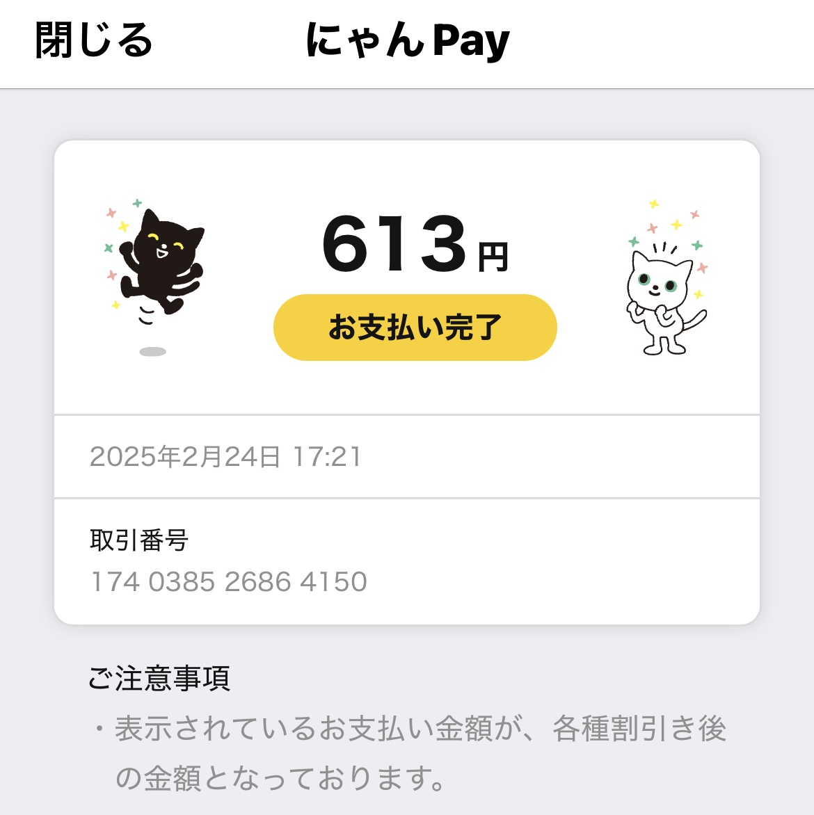 にゃんPayで支払い。613円でした。