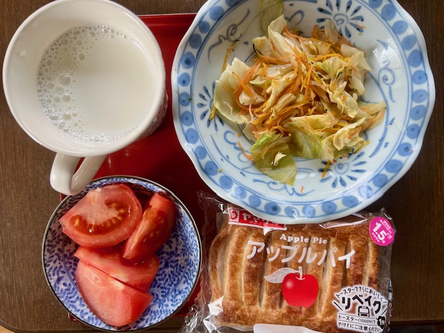 朝食は、アップルパイ、トマト、南瓜・キャベツ・人参の温野菜サラダ、牛乳。