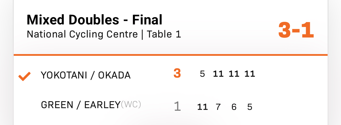 | 20:50 | T1 | 混合D-決勝 | 横谷晟/岡田琴菜 3-1 Connor GREEN/Sophie EARLEY(イングランド)![]() ![]() |