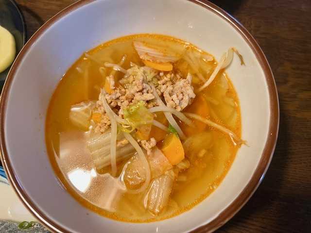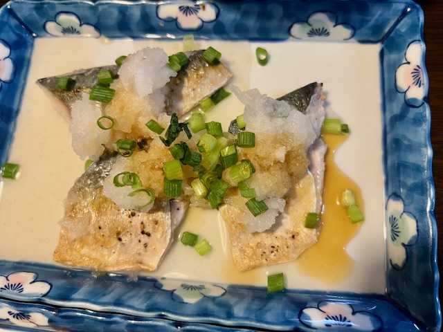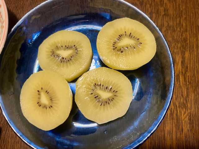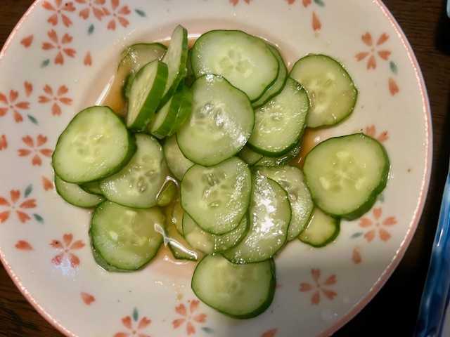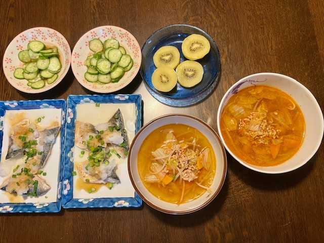 夕食は、焼き鯖・大根おろし・細ネギ・ポン酢、胡瓜・生姜・めんつゆ、鶏ひき肉・白菜・もやし・人参・麦ご飯・胡麻油のクッパ。ゴールドキウイ。