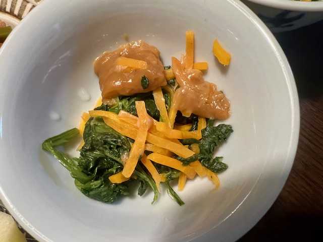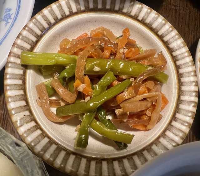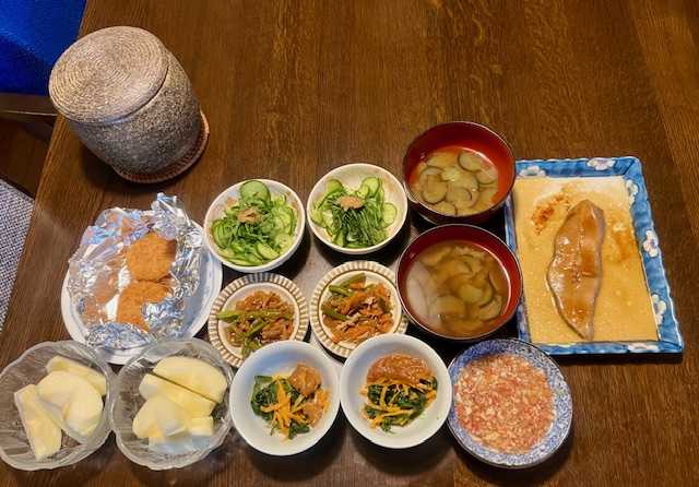 夕食は、からすがれいの生姜醤油煮、海老カツ、五目和え(筍・人参・ニンニクの芽・蒟蒻・油揚げ)、ほうれん草・人参のピーナッツ和え、胡瓜・紫蘇・梅干し、茄子の味噌汁、りんご、りんごの皮のレモン煮、ご飯。