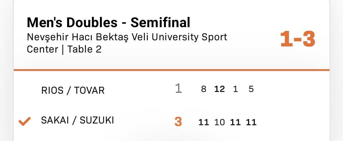 | 23:35 | T2 | 男子D-準決勝 | 坂井雄飛/鈴木颯 VS Carlos RIOS/Jesus TOVAR(ベネズエラ)![]() |
