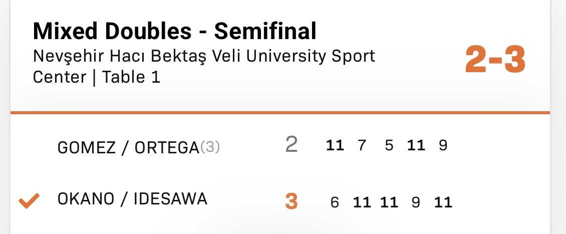 | 21:15 | T1 | 混合D-準決勝 | 岡野俊介/出澤杏佳 VS Gustavo GOMEZ/Daniela ORTEGA(チリ)![]() |