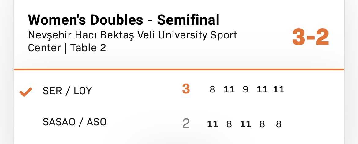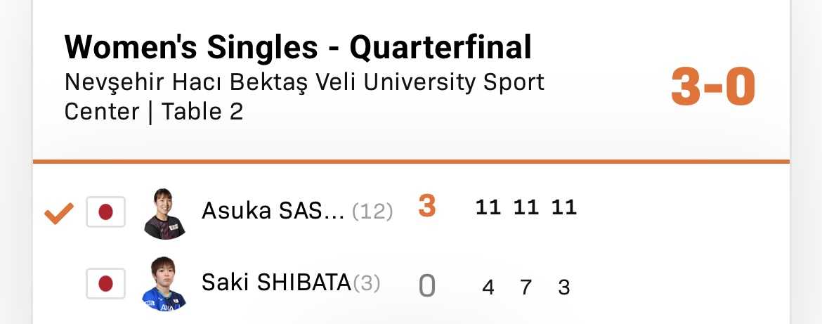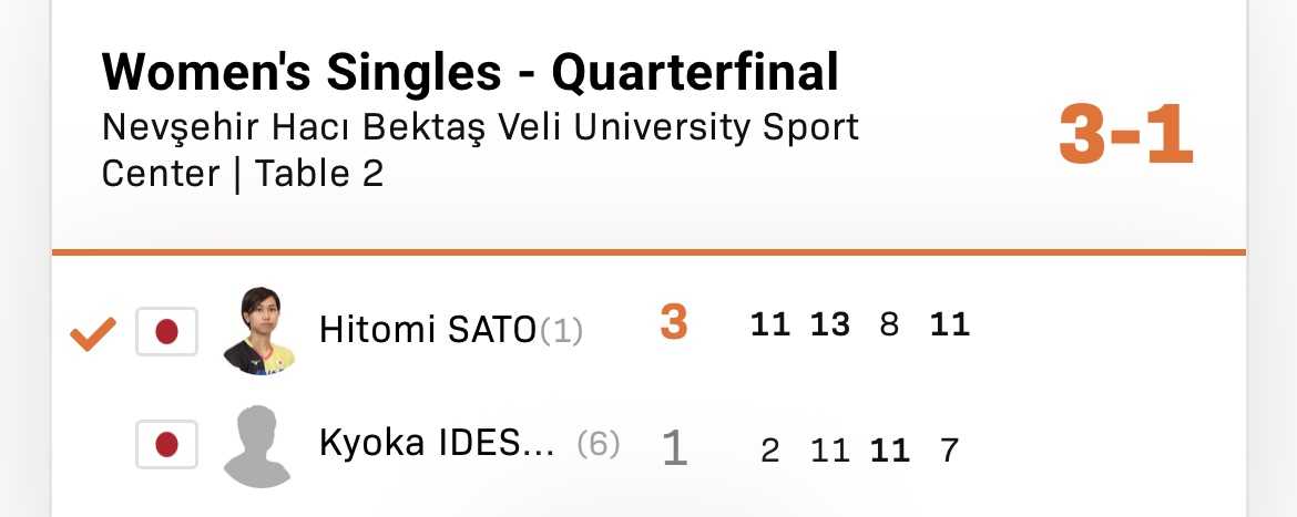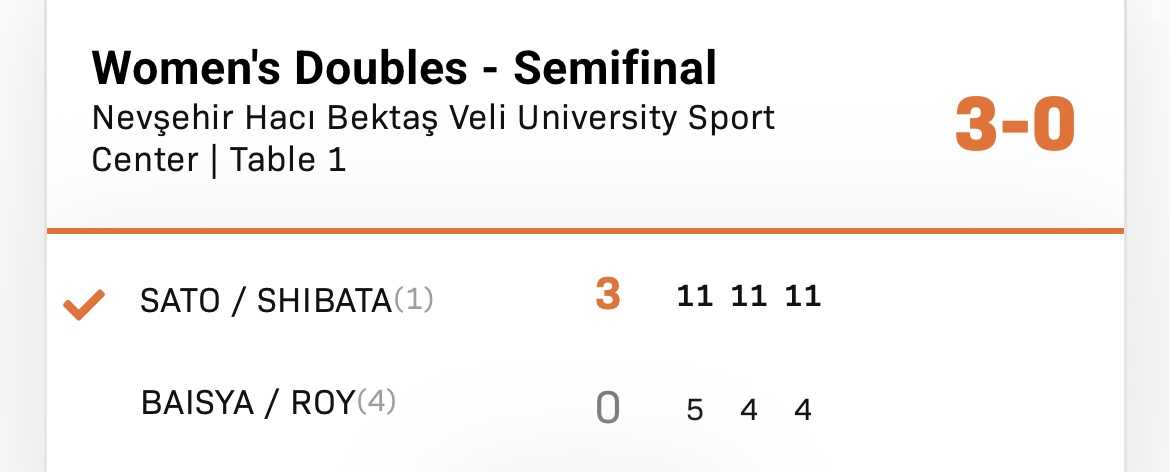 | 23:00 | T1 | 女子D-準決勝 | 佐藤瞳/芝田沙季 3-0 クリットウィカ・ロイ/Poymantee BAISYA(インド)![]() |