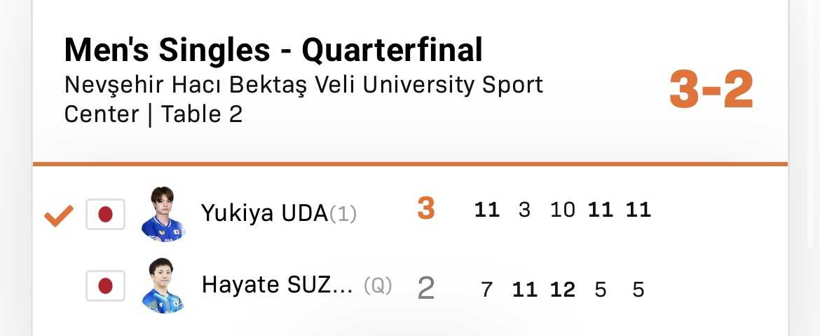 | 1:40 | T2 | 男子S-準々決勝 | 宇田幸矢WR35 3-2 鈴木颯WR376![]() |