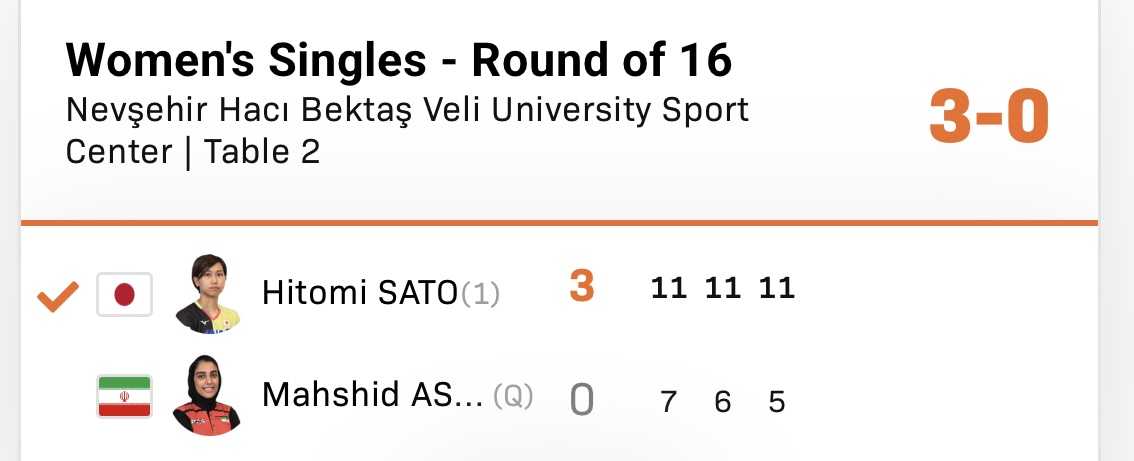 | 17:30 | T2 | 女子S-3回戦 | 佐藤瞳WR38 VS Mahshid ASHTARI(イラン)WR355![]() |
