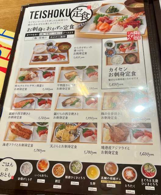 海鮮丼もあったのですね。まあ銀だらが食べたくなってカイセンお刺身定食にもしなかったからいいか。